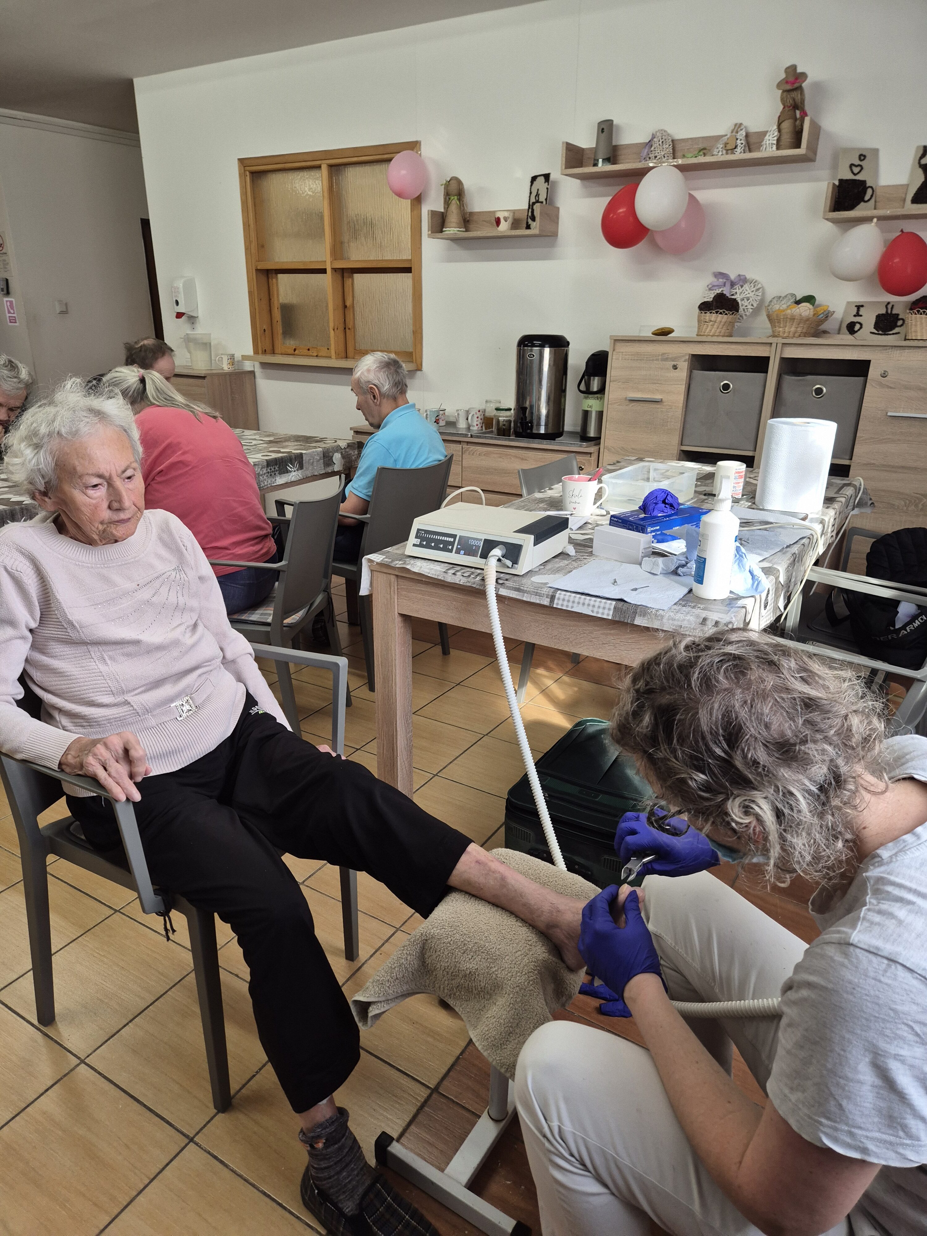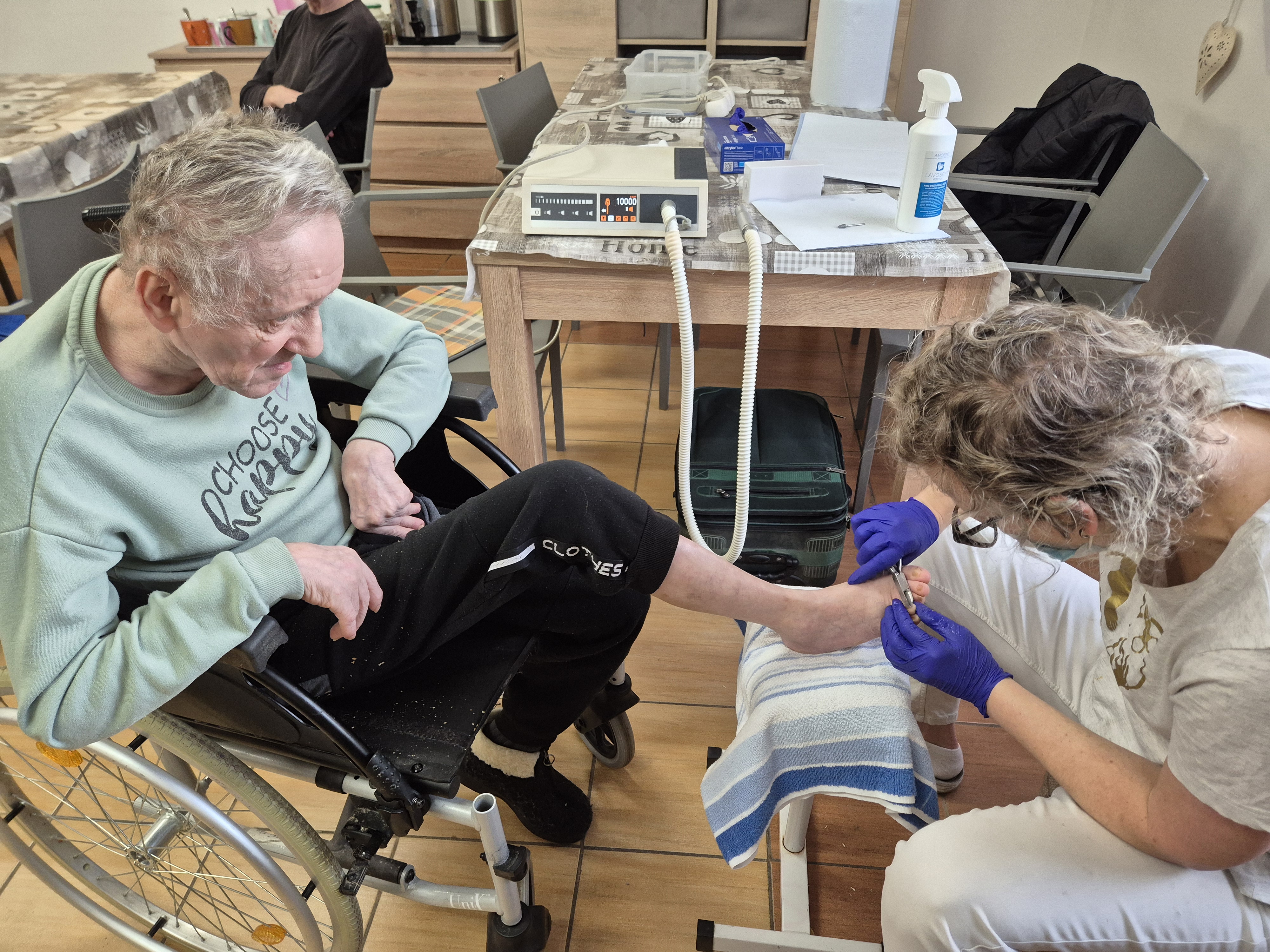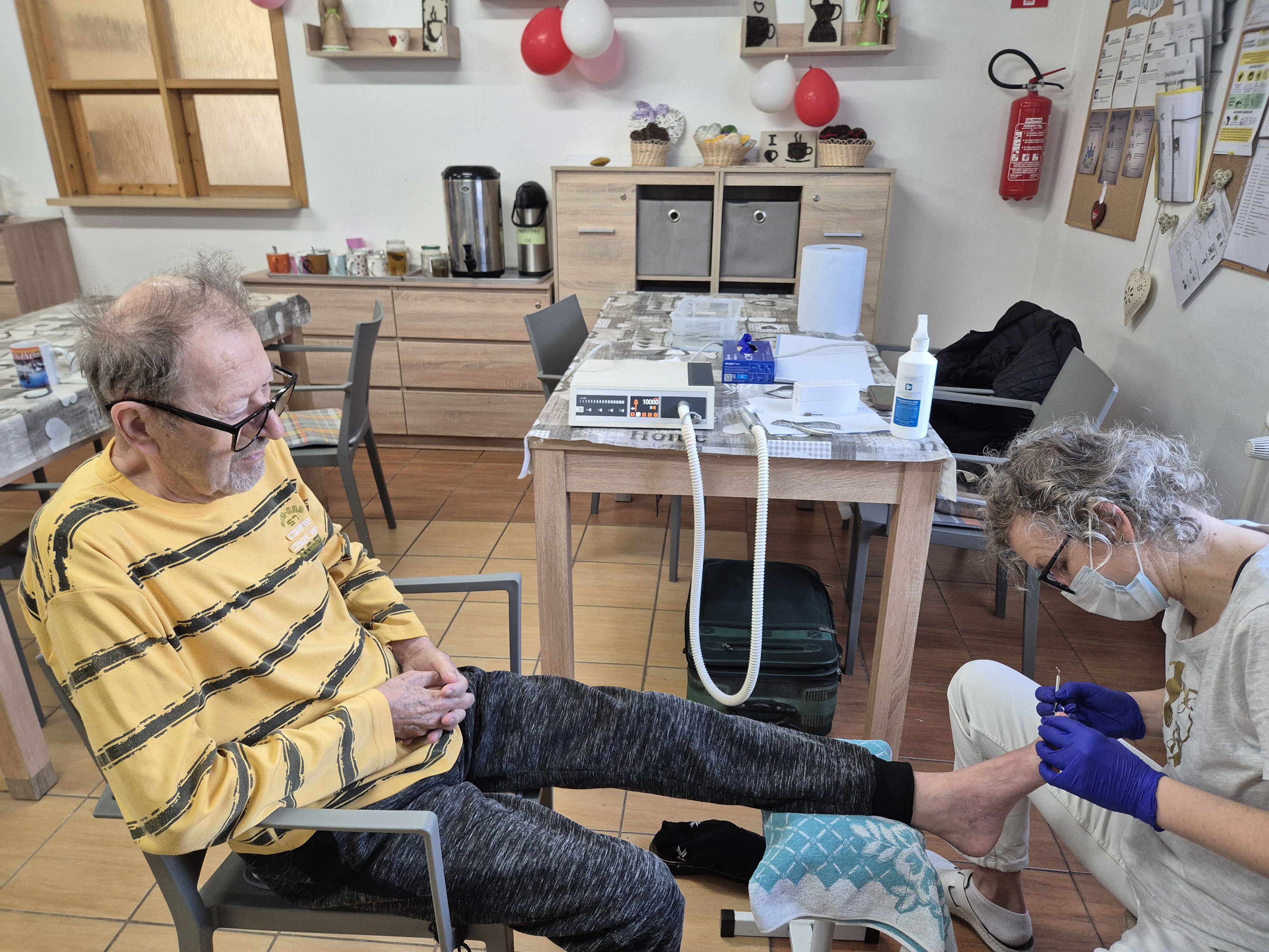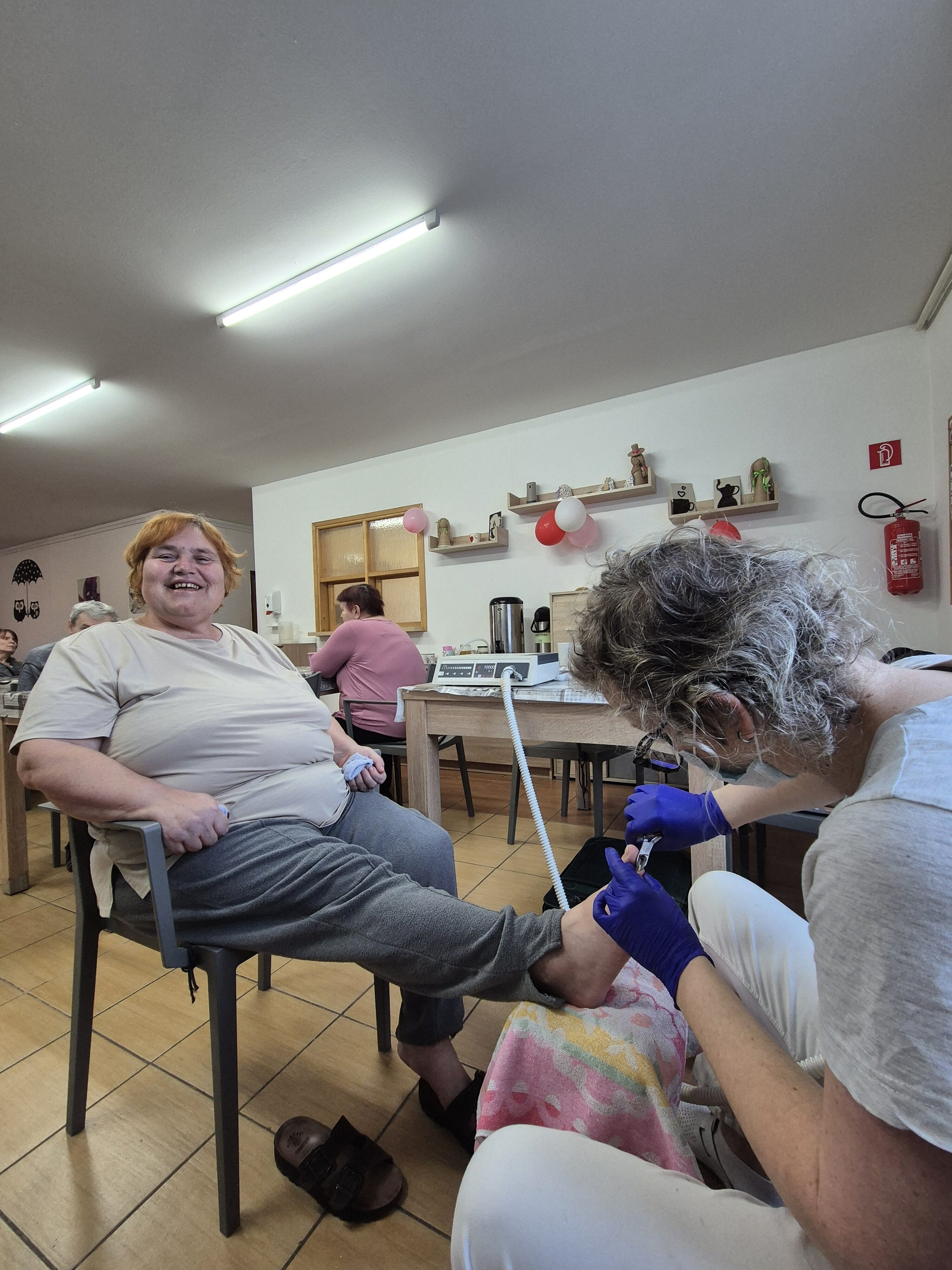Pedikérka p. Lenka prináša našim prijímateľom nielen odbornú starostlivosť, ale aj úsmev, pokoj a chvíľu starostlivosti, na ktorú sa tešia. Aj imobilní prijímatelia si zaslúžia cítiť sa dôstojne, komfortne a mať pocit starostlivosti o svoje telo.